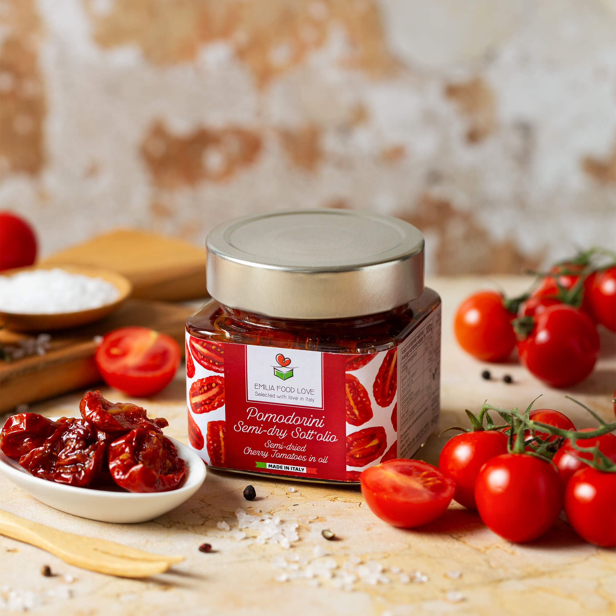 Less famous but even more versatile than their “cousins,” our semi-dried cherry tomatoes are perfect for pizza, focaccia, croutons, and bruschetta, as well as traditional pasta dishes. They pair beautifully with fresh cheeses, fish, cured meats, and more flavorful ingredients like olives, capers, and anchovies, adding a touch of vibrant color and delicious originality to all your recipes. -